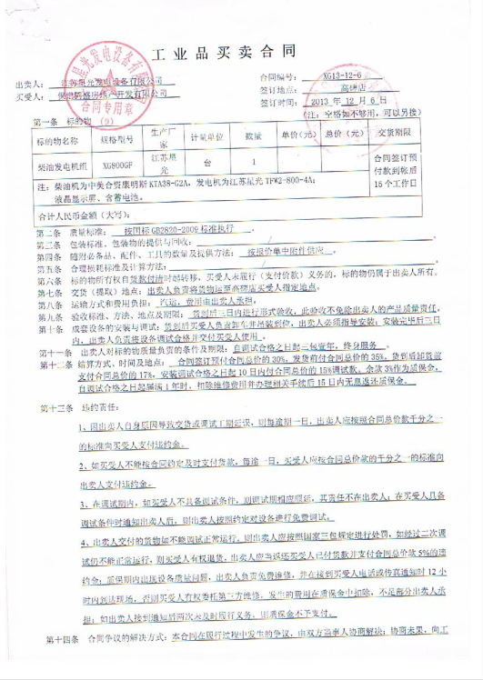 2013年12月6日,保定騰盛房地產(chǎn)開發(fā)有限公司與星光發(fā)電設(shè)備有限公司簽訂發(fā)電機(jī)組買賣合同,合同內(nèi)容為1臺(tái)800KW康明斯柴油發(fā)電機(jī)組。