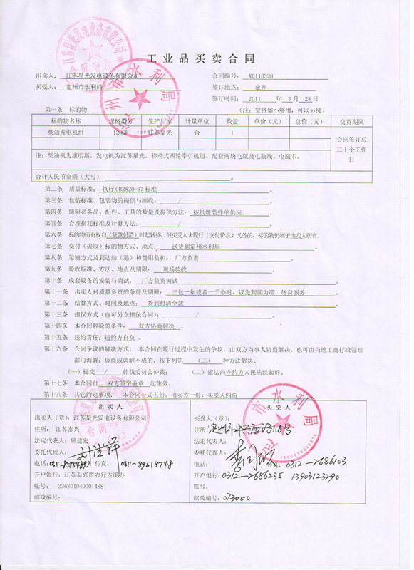 為保證應(yīng)急供電系統(tǒng),經(jīng)雙方溝通協(xié)商,定州市水利局與星光石家莊分公司簽訂供貨合同。根據(jù)合同,定州市水利局從星光訂購了一臺(tái)120KW柴油發(fā)電機(jī),選用的是康明斯柴油機(jī)配備江蘇星光發(fā)電機(jī)。
