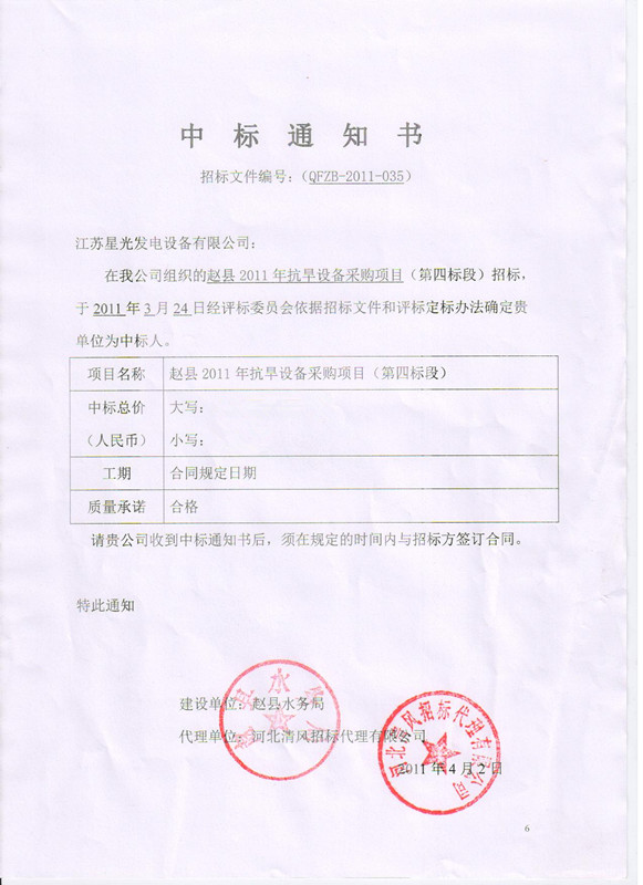 星光動(dòng)力集團(tuán)河北分公司通過自身實(shí)力的展示,獲得了由趙縣水務(wù)局委托河北清風(fēng)招標(biāo)代理有限公司招標(biāo)的趙縣水務(wù)局抗旱設(shè)備采購項(xiàng)目(第四標(biāo)段)中標(biāo)通知書。