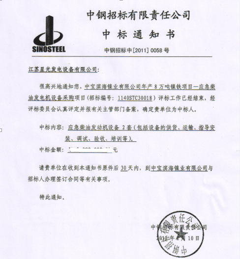 隨著經(jīng)濟(jì)的不斷發(fā)展和柴油發(fā)電機(jī)組需求的不斷擴(kuò)大,近年來(lái),星光公司市場(chǎng)銷售成績(jī)斐然。2011年初,星光公司成功拿下中寶濱海鎳業(yè)有限公司年產(chǎn)8萬(wàn)噸鎳鐵項(xiàng)目—應(yīng)急柴油發(fā)電機(jī)設(shè)備采購(gòu)項(xiàng)目,順利拿到中標(biāo)通知書(shū)。